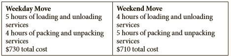 Weekday Move 5 hours of loading and unloading services 4 hours of packing and unpacking 5 hours of packing and unpacking Weekend Move 4 hours of loading and unloading services services services $730 total cost $710 total cost