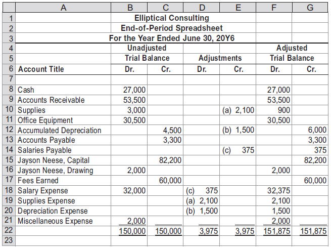 Elliptical Consulting is a consulting firm owned and operated by Jayson Neese. The following end-of-period spreadsheet was prepared for the year ended June 30, 20Y6:
