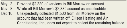 Ellison Heating and Air Conditioning, Inc., uses the direct write-off method to account for bad debts. Record the following transactions that occurred during the year:
