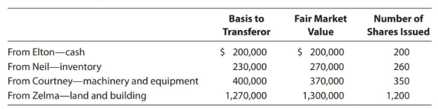 Basis to Fair Market Number of Transferor Value Shares Issued From Elton-cash $ 200,000 $ 200,000 200 From Neil-inventory From Courtney-machinery and equipment From Zelma-land and building 230,000 270,000 260 400,000 370,000 350 1,270,000 1,300,000 1,200