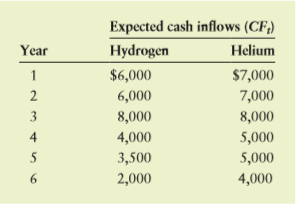 Expected cash inflows (CF,) Year Hydrogen Helium 1 $6,000 $7,000 2 6,000 7,000 3 8,000 8,000 4 4,000 5,000 3,500 5,000 2,000 4,000