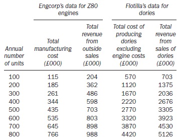 Engcorp makes an engine, the Z80, which it has been selling to external customers at £1350 per unit. Flotilla wanted to buy Z80 engines to use in its own production of dories; each dory requires one engine. Engcorp would only sell if Flotilla paid £1350 per unit. The managing director of Engcorp commented: