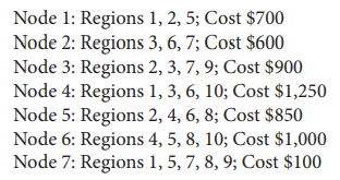 Enrique Brava is responsible for upgrading the wireless network for his employer. He has identified seven possible locations to install new nodes for the network. Each node can provide service to different regions within his employerâs corporate campus. The cost of installing each node and the regions that can be served by each node are summarized below.
