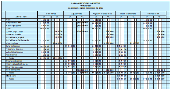 PARIOIOUSESCLEAN NG SERVICE WORKSHEET FORMONTH ENDED DECEMBER S1, 201X Trtal alance Adustmets Cr. Adjusted Trial ance ncomeStaement Balance Sht Acount Tes Dr. Cr. Dr Dr. Dr. Dr. ablolee Cash Prepald hsrance 145300 Cearing Supplen Elelao Auto 304000 Accum. Depr., Aute Accounts Payable B. Parkhouse, Captal B. Parkhoue, Withdrawals Cleaingfem Salares Expeme Teephane Epeme Advetsing Epese Gan bpene 23s00 2las bo lejoo Totals ImuranceExpeme leloo Cleaning SueleExpese Depr. bpene, Auto Salares Payable lgg Totals 2las bo 3os bo blob bo Net hcome Totals