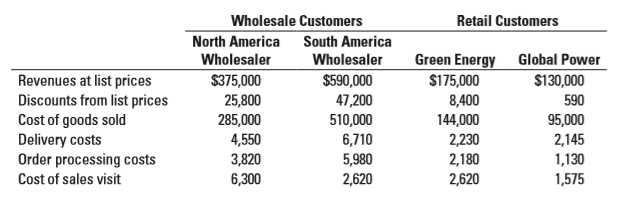 Wholesale Customers Retail Customers North America South America Wholesaler $375,000 25,800 285,000 Wholesaler $590,000 47,200 510,000 6,710 5,980 2,620 Green Energy $175,000 8,400 144,000 Global Power Revenues at list prices Discounts from list prices Cost of goods sold Delivery costs Order processing costs $130,000 590 95,000 2,145 1,130 1,575 4,550 2,230 3,820 6,300 2,180 2,620 Cost of sales visit