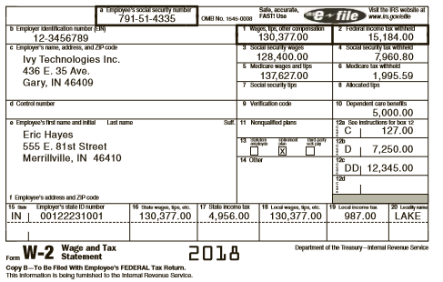 apoys y 791-51-4335 Sale, accurata, OMI No. 1545-000 FASTI Use Visthe RS weteile al efile www.s.gove D Employer identncalion umber EN 12-3456789 c Empioyer's , ess, and ZPcode wages, Ips, der campansn 130,377.00 15,184.00 SCEECELV BE Wn Ivy Technologies Inc. 436 E. 35 Ave. Gary, IN 46409 128,400.00 5 Modicare wages and tips 137,627.00 7 Social security ips 7,960.80 6 Modicare lax wthhod 1,995.59 8 Aocaledips d Control number 9 Veriloion0ode 10 Ixpende care bna 5,000.00 12a Sce nsiruciiors for bor 12 127.00 e Employoe's ame and intial Last name Su 11 Norpualted plans Eric Hayes 555 E. 81st Street 120 DI 7,250.00 Merrilville, IN 46410 DD 12,345.00 121 1 Enployee's addes and ZPcode 15 aa Emplyer's sdale ID number IN 00122231001 16 ute wgan, ps 17 Slale noomo lax 18 Locl wagen, ps te 19 Loclincome t 20 Leclty rano 130,377.00 4,956.00 130,377.00 987.00 LAKE Farm W-2 Wage and Tax Statement Department of the Treasury-itenal rene Service 2018 Copy B-To Be Filod With Employoo's FEDERAL Tax Roturm. This Information is boing fumishod to the Intemal Rovanue Servica.