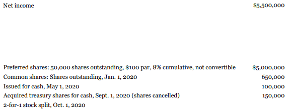Net Income $5,500,000 Preferred shares: 50,000 shares outstanding, $100 par, 8% cumulative, not convertible Common shares: Shares outstanding, Jan. 1, 2020 $5,000,000 650,000 Issued for cash, May 1, 2020 Acquired treasury shares for cash, Sept. 1, 2020 (shares cancelled) 100,000 150,000 2-for-1 stock split, Oct. 1, 2020