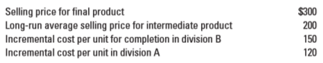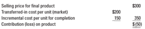 $300 Selling price for final product Long-run average selling price for intermediate product Incremental cost per unit for completion in division B Incremental cost per unit in division A 200 150 120 $300 Selling price for final product Transferred-in cost per unit (market) Incremental cost per unit for completion Contribution (loss) on product $200 150 350 S(50)