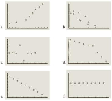 > Describe each of the following correlation coefficients using the terms strong, moderate, or weak and negative, or positive. a. r = 0.21 b. r = -0.87 c. r = 0.55 d. r = -0.099 e. r = 0.99 f. r = -0.49