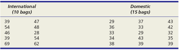 (b) At α = .05, is the variance greater for bags on an international flight? Show the hypotheses, decision rule, and test statistic.