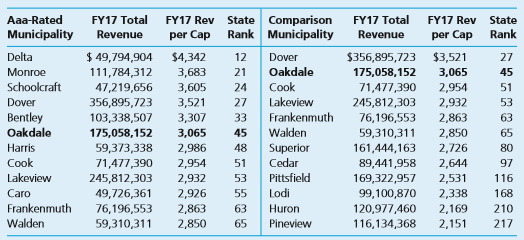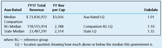 a. Prepare a histogram or bar graph that shows Oakdale in relation to the three reference groups, Aaa-rated median, comparison reference group, and state median for FY 2017 total revenue and a separate graph for FY 2017 revenue per capita.