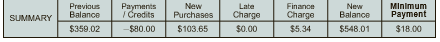 Previous Balance Рayments I Credits New Purchases Late Finance New Balance Minimum Charge Charge Payment SUMMARY $359.02 -$80.00 $103.65 $0.00 $5.34 $548.01 $18.00