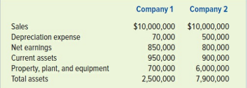 Company 1 Company 2 $10,000,000 70,000 850,000 950,000 700,000 2,500,000 $10,000,000 500,000 800,000 900,000 6,000,000 7,900,000 Sales Depreciation expense Net earnings Current assets Property, plant, and equipment Total assets