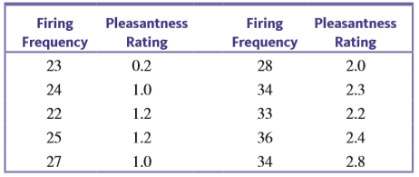 Researchers studying pleasant touch sensations measured the firing frequency (impulses per second) of nerves that were stimulated by a light brushing stroke on the forearm and also recorded the subjectâs numerical rating of how pleasant the sensation was. The accompanying data was read from a graph in the paper âcoding of pleasant touch by unmyelinated Afferents in humansâ (Nature Neuroscience, April 12, 2009).