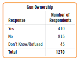Gun Ownership Number of Response Respondents Yes 410 No 815 Don't Know/Refused 45 Total 1270