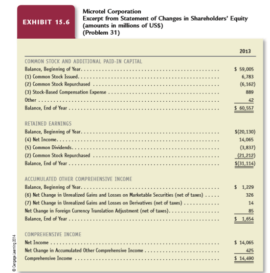 Microtel Corporation Excerpt from Statement of Changes in Shareholders' Equity (amounts in millions of US$) (Problem 31) EXHIBIT 15.6 2013 COMMON STOCK AND ADDITIONAL PAID-IN CAPITAL Balance, Beginning of Year... $ 59,005 (1) Common Stock Issued. 6,783 (2) Common Stock Repurchased (6,162) (3) Stock-Based Compensation Expense 889 Other 42 Balance, End of Year $ 60,557 RETAINED EARNINGS Balance, Beginning of Year... (4) Net Income.... $(20,130) 14,065 (5) Common Dividends. (3,837) (2) Common Stock Repurchased (21,212) $(31,114) Balance, End of Year ACCUMULATED OTHER COMPREHENSIVE INCOME Balance, Beginning of Year.... $ 1,229 (6) Net Change in Unrealized Gains and Losses on Marketable Securities (net of taxes) 326 (7) Net Change in Unrealized Gains and Losses on Derivatives (net of taxes) 14 Net Change in Foreign Currency Translation Adjustment (net of taxes). . Balance, End of Year 85 $ 1,654 COMPREHENSIVE INCOME Net Income $ 14,065 Net Change in Accumulated Other Comprehensive Income . Comprehensive Income 425 $ 14,490 O Cangaga Leaming 2014