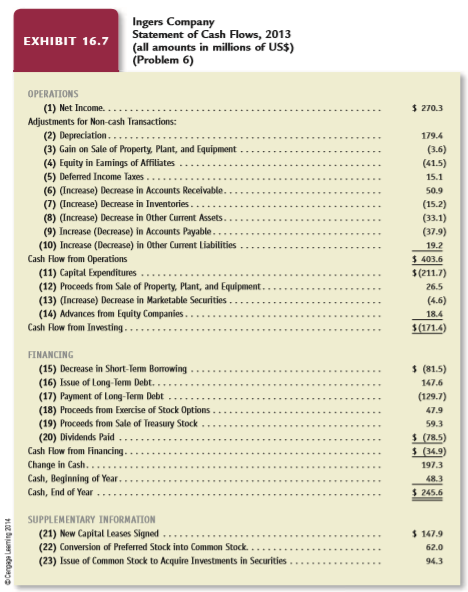 Ingers Company Statement of Cash Flows, 2013 (all amounts in millions of US$) (Problem 6) EXHIBIT 16.7 OPERATIONS (1) Net Income. Adjustments for Non-cash Transactions: (2) Depreciation..... (3) Gain on Sale of Property, Plant, and Equipment (4) Equity in Eamings of Affiliates (5) Deferred Income Taxes.. (6) (Increase) Decrease in Accounts Receivable. (7) (Increase) Decrease in Inventories. (8) (Increase) Decrease in Other Current Assets. (9) Increase (Decrease) in Accounts Payable.. (10) Increase (Decrease) in Other Curent Liabilities Cash Flow from Operations $ 270.3 179.4 (3.6) (41.5) 15.1 50.9 (15.2) (33.1) (37.9) 19.2 $ 403.6 $(211.7) (11) Capital Expenditures (12) Proceeds from Sale of Property, Plant, and Equipment. (13) (Increase) Decrease in Marketable Securities.. (14) Advances from Equity Companies.. Cash Flow from Investing. 26.5 (4.6) 18.4 $(171.4) FINANCING $ (81.5) 147.6 (129.7) (15) Decrease in Short-Term Borrowing (16) Issue of Long-Term Debt.. (17) Payment of Long-Term Debt (18) Proceeds from Exercise of Stock Options. (19) Proceeds from Sale of Treasury Stock (20) Dividends Paid Cash Flow from Financing. 47.9 59.3 $ (78.5) $ (34.9) Change in Cash. Cash, Beginning of Year. Cash, End of Year 197.3 48.3 $ 245.6 SUPPLEMENTARY INFORMATION (21) New Capital Leases Signed (22) Conversion of Preferred Stock into Common Stock. (23) Issue of Common Stock to Acquire Investments in Securities $ 147.9 62.0 94.3