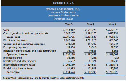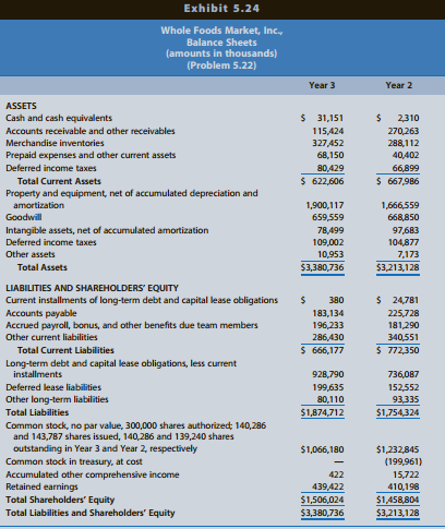 Exhibit 5.24 Whole Foods Market, Inc., Balance Sheets (amounts in thousands) (Problem 5.22) Year 3 Year 2 ASSETS $ 31,151 Cash and cash equivalents Accounts receivable and other receivables 2,310 115,424 270,263 Merchandise inventories 327,452 288,112 Prepaid expenses and other current assets Deferred income taxes 68,150 40,402 66,899 80,429 $ 622,606 Total current assets $ 667,986 Property and equipment, net of accumulated depreciation and amortization 1,900,117 1,666,559 Goodwill 659,559 668,850 Intangible assets, net of accumulated amortization Deferred income taxes 78,499 97,683 109,002 104,877 Other assets 10,953 7,173 Total Assets $3,380,736 $3,213,128 LIABILITIES AND SHAREHOLDERS' EQUITY Current installments of long-term debt and capital lease obligations Accounts payable Accrued payroll, bonus, and other benefits due team members 380 $ 24,781 183,134 225,728 181,290 340,551 $ 772,350 196,233 Other current liabilities 286,430 Total current liabilities $ 666,177 Long-term debt and capital lease obligations, less current installments 928,790 736,087 Deferred lease liabilities 199,635 152,552 Other long-term liabilities 80,110 93,335 Total Liabilities $1,874,712 $1,754,324 Common stock, no par value, 300,000 shares authorized; 140,286 and 143,787 shares issued, 140,286 and 139,240 shares outstanding in Year 3 and Year 2, respectively Common stock in treasury, at cost $1,066,180 $1,232,845 (199,961) Accumulated other comprehensive income Retained earnings Total Shareholders' EQUITY Total Liabilities and Shareholders' EQUITY 422 15,722 439,422 410,198 $1,506,024 $1,458,804 $3,380,736 $3,213,128 Exhibit 5.25 Whole Foods Market, Inc., Income Statements (amounts in thousands) (Problem 5.22) Year 3 Year 2 Year 1 Sales $7,953,912 $6,591,773 $5,607,376 Cost of goods sold and occupancy costs 5,247,207 4,295,170 3,647,734 $1,959,642 1,421,968 Gross Profit $2,706,705 $2,296,603 Direct store expenses General and administrative expenses Pre-opening expenses Relocation, store closure, and lease termination 2,107,940 1,711,229 270,428 217,743 181,244 55,554 59,319 32,058 Operating Income Interest expense 36,545 $ 236,238 (36,416) 10,861 $ 297,451 5,363 $ 319,009 (4,208) (32) Investment and other income 6,697 $ 206,519 91,995 $ 114,524 11,324 20,736 $ 304,567 121,827 $ 182,740 $ 339,713 135,885 $ 203,828 Income before income taxes Provision for income taxes Net Income Source: Whole Foods Market, Inc, Form 10-K for the Fiscal Year Ended September 28, 2008.