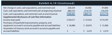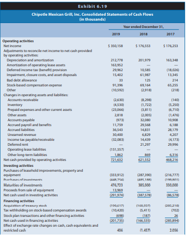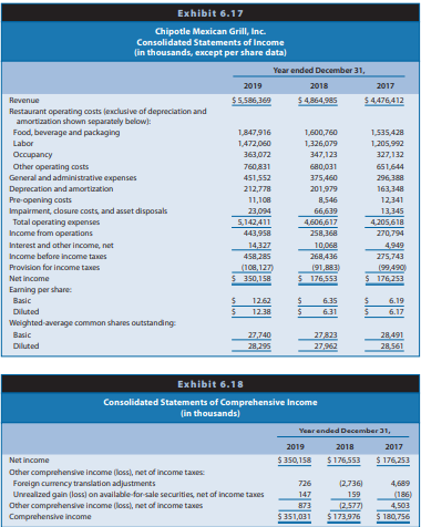 Exhibits 6.17â6.19 present the December 31, 2019, Consolidated Statements of Income, Statements of Comprehensive Income, Consolidated Statements of Cash Flows for Chipotle Mexican Grill, Inc. Notes 5 and 6 to the financial statements provide additional information to support the financial statements.
