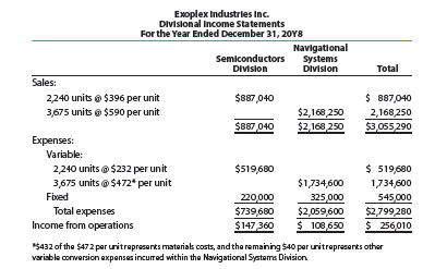 Exoplex Industries Inc. Divisional Income Statements For the Year Ended December 31, 20Y8 Navigational Systems Division Semiconductors Division Total Sales: 2240 units e $396 per unit 3,675 units e $590 per unit $ 887,040 2,168,250 $3,055,290 $887,040 $2,168,250 $87 040 $2,168 250 Expenses: Variable: 2,240 units @ $232 per unit 3,675 units @ $472* per unit $ 519,680 1734,600 545,000 $2,799,280 $ 256010 $519,680 $1,734,600 Fixed Total expenses Income from operations 220,000 $739,680 $147 360 325,000 $2,059,600 $ 108,650 *5432 of the $472 per unitropresents matariak costs, and the remaining $40 per unitropresarts other variable conversion expenses incurred within the Navigational Systems Division