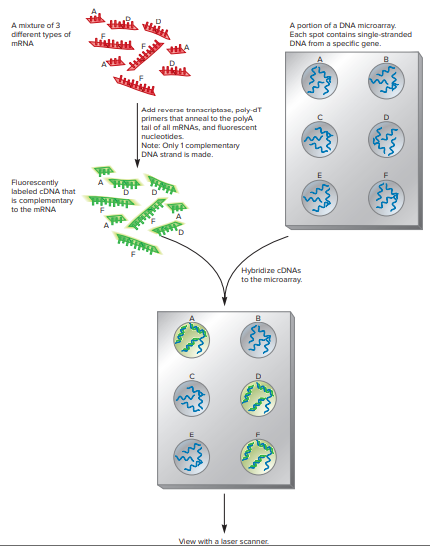 A mixture of 3 different types of MRNA A portion of a DNA microarray. Each spot contains single-stranded DNA from a specific gene. A Add reverae tranacriptase, paly-dT primers that anneal to the polyA tail of all MRNAS, and fluorescent nucleotides. Nate: Only 1 complementary DNA strand is made. Fluorescently labeled CDNA that is complementary to the MRNA Hybridize CDNAS to the microarray. View with a laser scanner