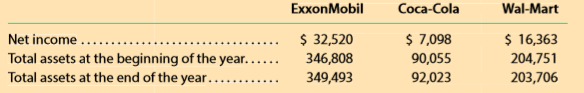 ExxonMobil Coca-Cola Wal-Mart $ 16,363 Net income.... Total assets at the beginning of the year...... Total assets at the end of the year.. $ 32,520 $ 7,098 346,808 90,055 204,751 349,493 92,023 203,706