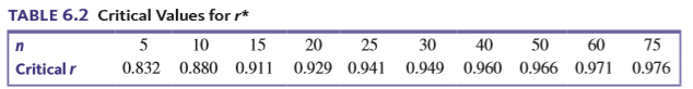 14 15 11 10 6 15 16 -1.364 -0.758 –0.353 0 0.353 0.758 1.364 TABLE 6.2 Critical Values for r* 5 10 15 20 25 30 40 50 60 75 Critical r 0.832 0.880 0.911 0.929 0.941 0.949 0.960 0.966 0.971 0.976