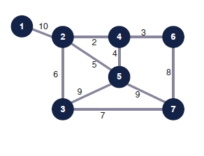 > Given the following network with the indicated distances between nodes (in miles), determine the shortest route from node 1 to each of the other six nodes (2, 3, 4, 5, 6, and 7):