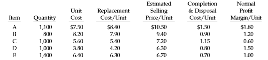 Fiedler Co. follows the practice of valuing its inventory at the lower-of cost-or-market. The following information is available from the companyâs inventory records as of December 31, 2017.