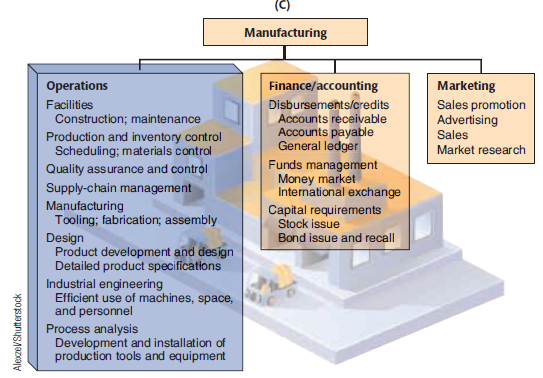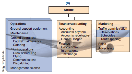 (A) Commercial Bank FANK Marketing Operations Teller scheduling Check clearing Finance Investments Securities Loans Commercial Industrial Financial Personal Mortgage Collection Real estate Transaction processing Facilities design/layout Vault operations Accounting Maintenance Security Auditing Trust department stockshoppe/Shutterstock (B) Airline Finance/accounting Operations Ground support equipment Accounting Accounts payable Accounts receivable General ledger Finance Cash control Marketing Traffic administration Reservations Schedules Tariffs (pricing) Sales Advertising Maintenance Ground operations Facility maintenance Catering Flight operations Crew scheduling Flying Communications Dispatching Management science International exchange Sergy Serdyuk/Fotdlia Manufacturing Operations Finance/accounting Marketing Sales promotion Advertising Sales Facilities Disbursements/credits Construction; maintenance Accounts receivable Accounts payable General ledger Production and inventory control Scheduling; materials control Quality assurance and control Market research Funds management Money market International exchange Supply-chain management Manufacturing Tooling; fabrication; assembly Capital requirements Stock issue Design Product development and design Detailed product specifications Industrial engineering Efficient use of machines, space, and personnel Process analysis Development and installation of production tools and equipment Bond issue and recall AlexzeVShutterstock