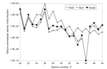 1.0E+00 +Soil eSun -Crust 1.0E-02 1.0E-04 1.0E-06 1.0E-08 1.0E-10 20 22 24 26 28 30 32 34 36 38 40 Atomic number, Z Silicon-normalized atomic mole fraction