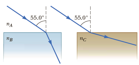 Figure CQ22.4 shows light from material A with index of refraction nA entering materials B and C with indices of refraction nB and nC. Rank the three indices of refraction from largest to smallest.