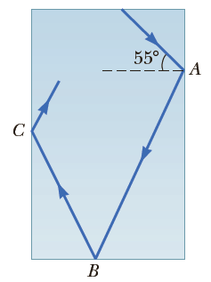Figure P22.16 shows a light ray traveling in a slab of crown glass surrounded by air. The ray is incident on the right surface at an angle of 55° with the normal and then reflects from points A, B, and C.