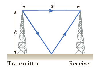 Figure P24.69 shows a radio - wave transmitter and a receiver, both h = 50.0 m above the ground and d = 6.00 x 102 m apart. The receiver can receive signals directly from the transmitter and indirectly from signals that bounce off the ground. If the ground is level between the transmitter and receiver and a λ/2 phase shift occurs upon reflection, determine the longest wavelengths that interfere