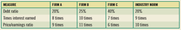 MEASURE FIRM A FIRM B FIRM C INDUSTRY NORM Debt ratio 20% 25% 40% 20% Times interest earned 8 times 10 times 7 times 9 times Price/earnings ratio 9 times 11 times 6 times 10 times