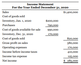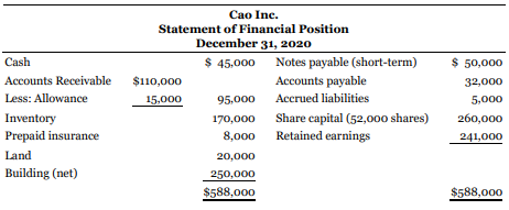 Cao Inc. Statement of Financial Position December 31, 2020 Cash $ 45,000 Notes payable (short-term) $ 50,000 Accounts payable Accrued liabilities Accounts Receivable $110,000 32,000 Less: Allowance 15,000 95,000 5,000 Inventory Share capital (52,00o shares) Retained earnings 170,000 260,000 Prepaid insurance 8,000 241,000 Land 20,000 Building (net) 250,000 $588,000 $588,000 Income Statement For the Year Ended December 31, 2020 Sales $1,400,000 Cost of goods sold Inventory, Jan. 1, 2020 $200,000 Purchases 790,000 Cost of goods available for sale 990,000 Inventory, Dec. 31, 2020 170,000 Cost of goods sold 820,000 Gross profit on sales 580,000 Operating expenses 170,000 Income before income taxes 410,000 Income tax expense 125,000 Net income $ 285,000