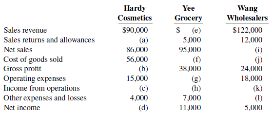 Hardy Wang Wholesalers Yee Cosmetics Grocery Sales revenue $90,000 $ (e) $122,000 Sales returns and allowances (a) 86,000 56,000 5,000 12,000 Net sales 95,000 (i) (j) 24,000 Cost of goods sold Gross profit Operating expenses Income from operations Other expenses and losses (f) (b) 15,000 38,000 (g) (h) 18,000 (c) 4,000 (k) (1) 7,000 Net income (d) 11,000 5,000