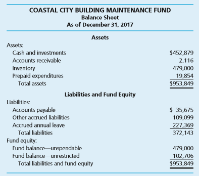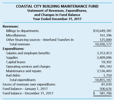 Financial Statements for the Building Maintenance Fund, an internal service fund of Coastal City, are reproduced here. No further information about the nature or purposes of this fund is given in the annual report.