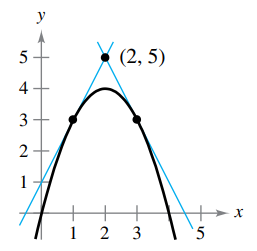 > Consider the function f(x) = 6x – x2 and the point P(2, 8) on the graph of f. a. Graph f and the secant lines passing through P(2, 8) and Q(x, f(x)) for x-values of 3, 2.5, and 1.5. b. Find the slope of each secant line. c. Use the results of part (b) to