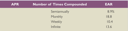 APR Number of Times Compounded EAR Semiannually 8.9% Monthly 18.8 Weekly 10.4 Infinite 13.6