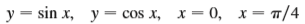 у — sin x, у — сos x, х — 0, х— п/4 TT