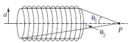 Find the magnetic ï¬eld at point P on the axis of a tightly wound solenoid (helical coil) consisting of n turns per unit length wrapped around a cylindrical tube of radius a and carrying current I (Fig. 5.25). Express your answer in terms of θ1 and θ2 (itâs easiest that way). Consider the turns to be essentially circular, and use the result of Ex. 5.6. What is the ï¬eld on the axis of an inï¬nite solenoid (inï¬nite in both directions)?