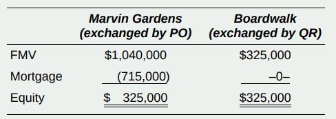 Marvin Gardens Boardwalk (exchanged by PO) (exchanged by QR) FMV $1,040,000 $325,000 Mortgage (715,000) -0- Equity $ 325,000 $325,000
