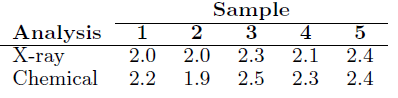 Five samples of a ferrous-type substance were used to determine if there is a difference between a laboratory chemical analysis and an X-ray fluorescence analysis of the iron content. Each sample was split into two subsamples and the two types of analysis were applied. Following are the coded data showing the iron content analysis: