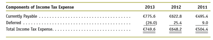 Components of Income Tax Expense 2013 2012 2011 Currently Payable €775.6 €622.8 €495.4 Deferred ... (26.0) 25.4 9.0 Total Income Tax Expense. . €749.6 €648.2 €504.4