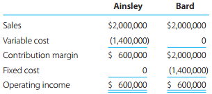 Ainsley Bard Sales $2000,000 $2,000,000 Variable cost (1,400,000) Contribution margin $ 600,000 $2,000,000 Fixed cost (1,400,000) Operating income $ 600,000 $ 600,000