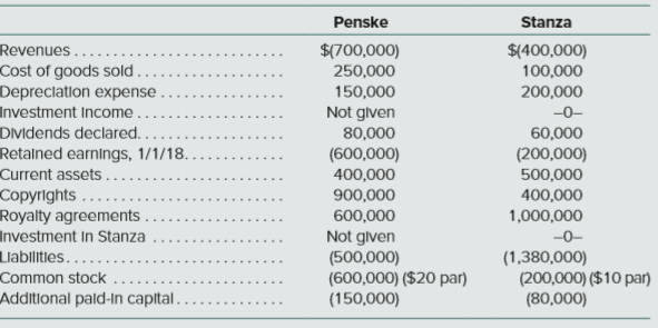 Penske Stanza Revenues.... Cost of goods sold . Depreclation expense $(700,000) 250,000 $(400,000) 100,000 150,000 200,000 Investment Income.. Not glven 80,000 -0- DIMdends declared.. Retalned earnings, 1/1/18. Current assets.... Copyrights Royalty agreements. Investment In Stanza 60,000 (200,000) 500,000 (600,000) 400,000 900,000 400,000 600,000 1,000,000 Not glven (500,000) (600,000) ($20 par) (150,000) -0- Llabilities.…... (1,380,000) (200,000) ($10 par) (80,000) Common stock Additional pald-In capital.