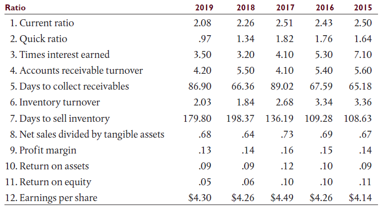 Ratio 2019 2018 2017 2016 2015 1. Current ratio 2.08 2.26 2.51 2.43 2.50 2. Quick ratio .97 1.34 1.82 1.76 1.64 3. Times interest earned 3.50 3.20 4.10 5.30 7.10 4. Accounts receivable turnover 4.20 5.50 4.10 5.40 5.60 5. Days to collect receivables 86.90 66.36 89.02 67.59 65.18 6. Inventory turnover 2.03 1.84 2.68 3.34 3.36 7. Days to sell inventory 8. Net sales divided by tangible assets 9. Profit margin 179.80 198.37 136.19 109.28 108.63 .68 .64 .73 .69 .67 .13 .14 .16 .15 .14 10. Return on assets .09 .09 .12 .10 .09 11. Return on equity .05 .06 .10 .10 .11 12. Earnings per share $4.30 $4.26 $4.49 $4.26 $4.14