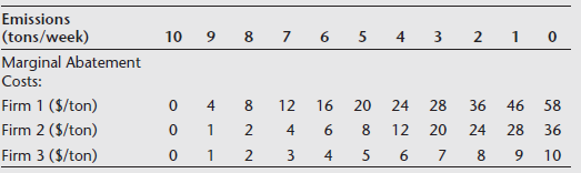 Emissions (tons/week) 9 8 5 4 3 2 1 0 10 7 Marginal Abatement Costs: Firm 1 ($/ton) 8 12 16 20 24 28 36 46 58 Firm 2 ($/ton) 1 2 4 6. 8. 12 20 24 28 36 Firm 3 ($/ton) 1 2 4 5 8 10
