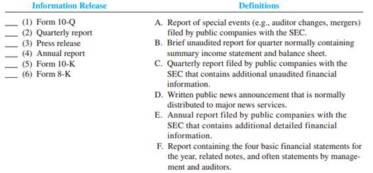 Information Release Definitions (1) Form 10-Q (2) Quarterly report (3) Press release (4) Annual report (5) Form 10-K (6) Form 8-K A. Report of special events (e.g., auditor changes, mergers) filed by public companies with the SEC. B. Brief unaudited report for quarter normally containing summary income statement and balance sheet. C. Quarterly report filed by public companies with the SEC that contains additional unaudited financial information. D. Written public news announcement that is normally distributed to major news services. E. Annual report filed by public companies with the SEC that contains additional detailed financial information. F. Report containing the four basic financial statements for the year, related notes, and often statements by manage- ment and auditors.